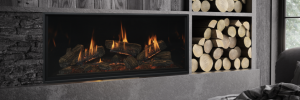 Slim profile direct vent fireplace with traditional log set and low clearances.